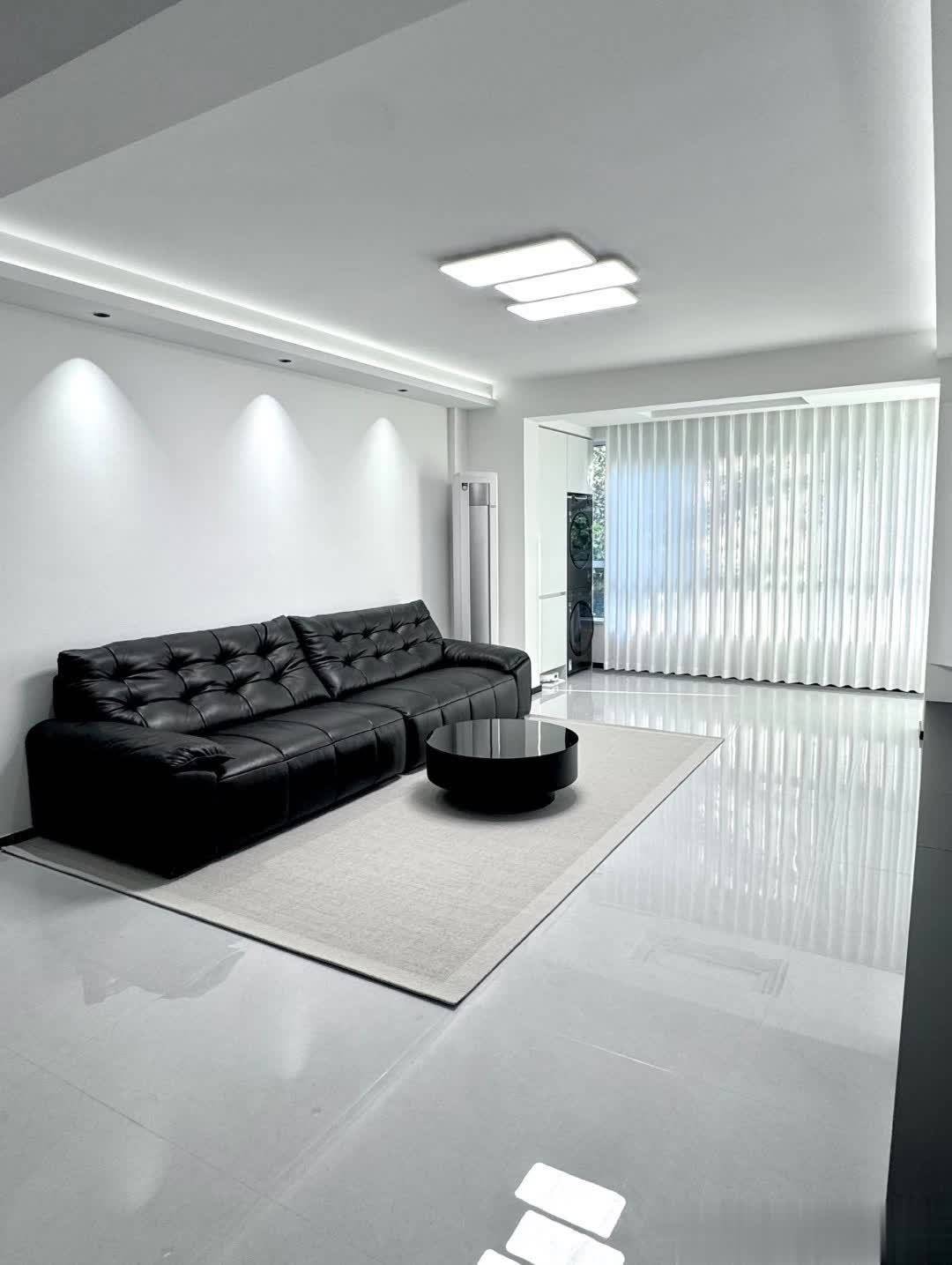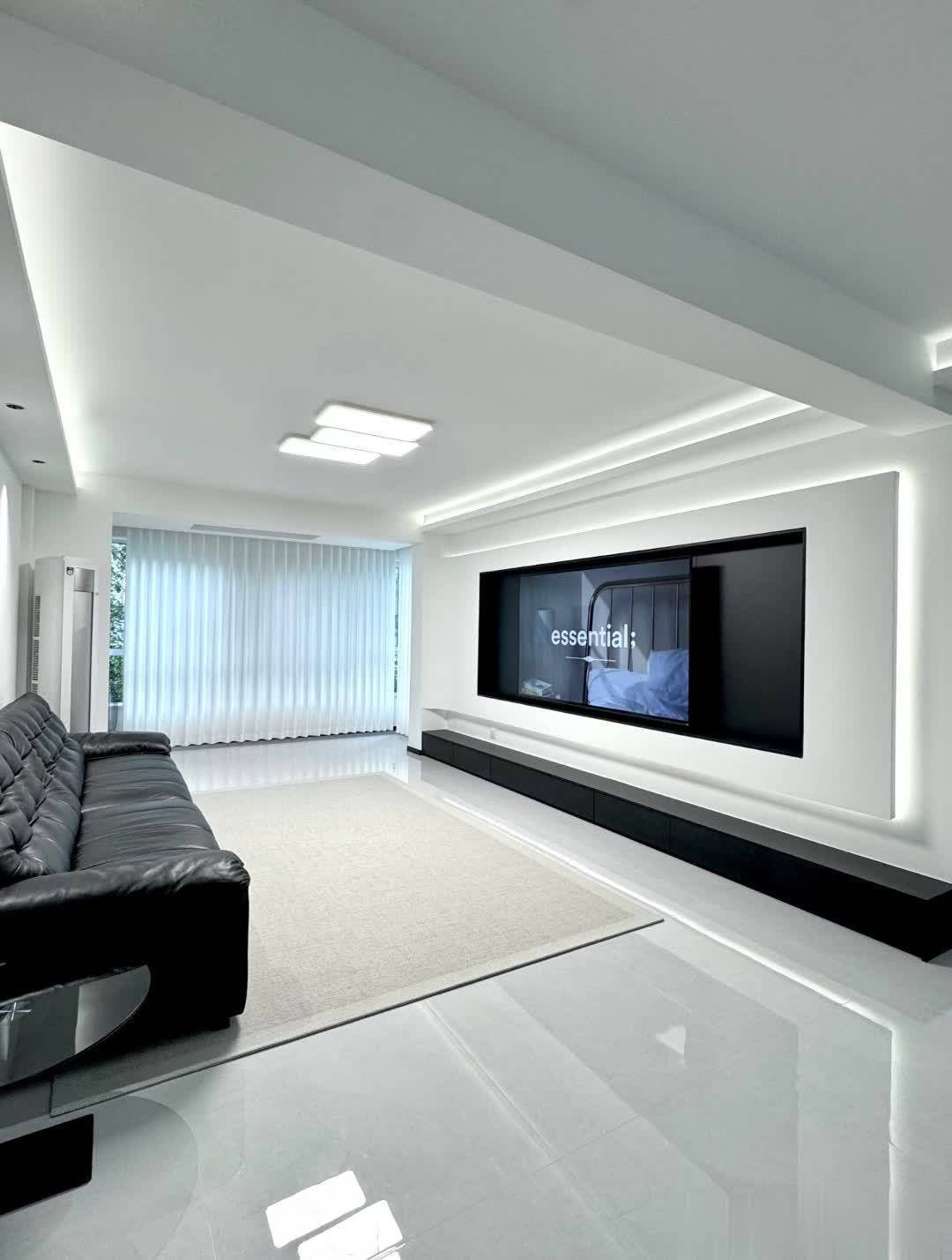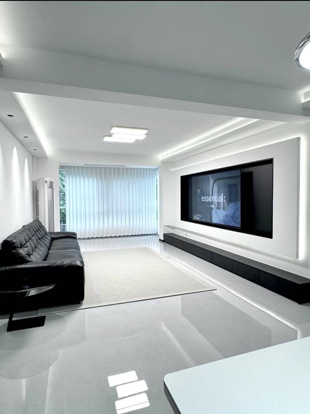 客厅整体色调为白色和黑色,营造出简洁高级的氛围。中央摆放黑色皮质沙发与黑色圆形茶几,舒适又时尚。电视墙设计简洁,嵌入式大电视与下方黑色低柜呼应,收纳空间充足。顶部线条灯提供柔和照明,提升空间层次感。大窗户和白色窗帘让自然光线充足进入,使空间更明亮宽敞。