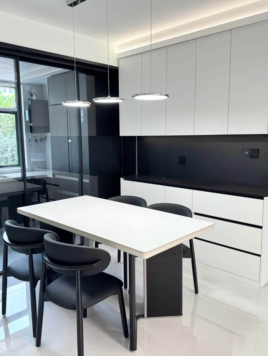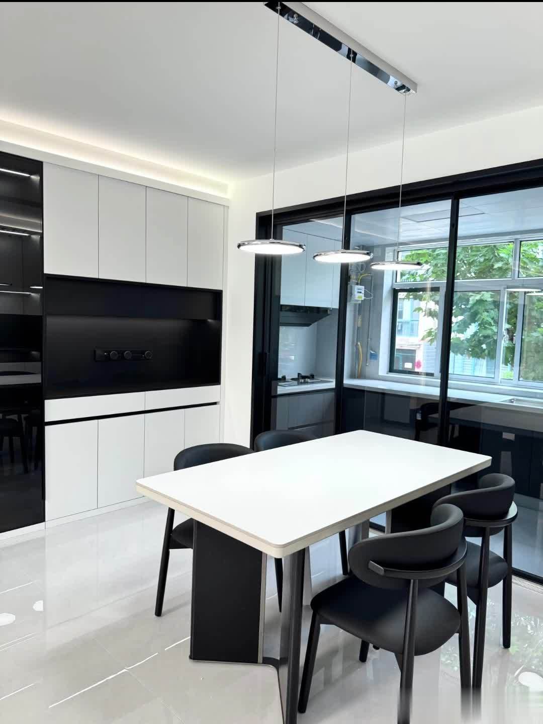白色餐桌搭配黑色桌腿,周围环绕四把黑色椅子,提供舒适用餐环境。餐桌上空悬挂三盏圆形吊灯,实用又具装饰性。