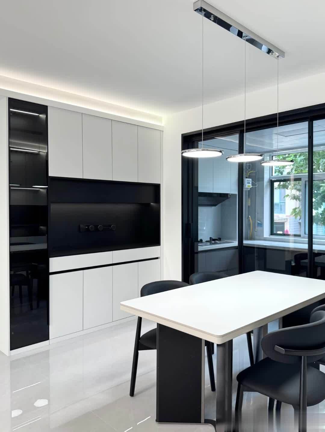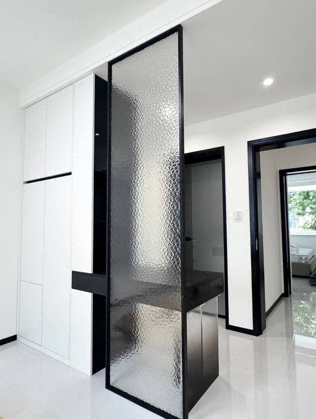 玄关与隔断区域,以白色和黑色为主色调,搭配独特质感的波纹玻璃隔断,既能分隔空间,又保持视觉通透。左侧白色储物柜收纳空间充足,中间黑色台面设计巧妙,可临时置物且与整体风格协调。右侧门洞通向其他房间,黑色门框与隔断黑色边框呼应,增强空间整体感。