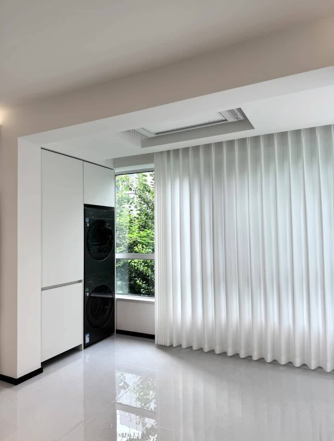 阳台与洗衣区集成了洗衣机和储物柜,节省空间。洗衣机上下叠放,上方柜子收纳空间充足。窗户旁挂着白色窗帘,实用又美观。窗外绿树成荫,让人心情愉悦。整体色调以白色和黑色为主,简洁现代,适合日常洗衣晾晒,是理想功能空间。