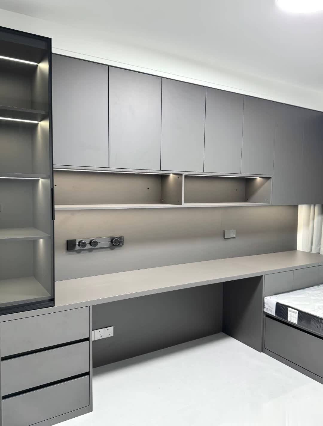 整体色调为灰色和白色,营造温馨舒适氛围。床铺上白色床单,阳光透过窗户洒入,使空间明亮温暖。窗户两侧挂着白色窗帘实用又美观。书房区域采用大面积灰色橱柜,收纳空间充足。上方开放格可展示书籍和装饰品,下方台面作为工作区。